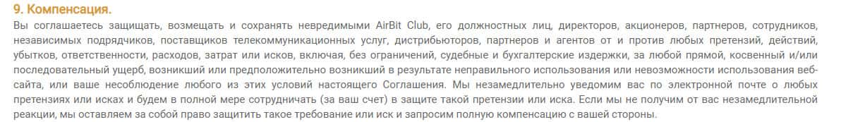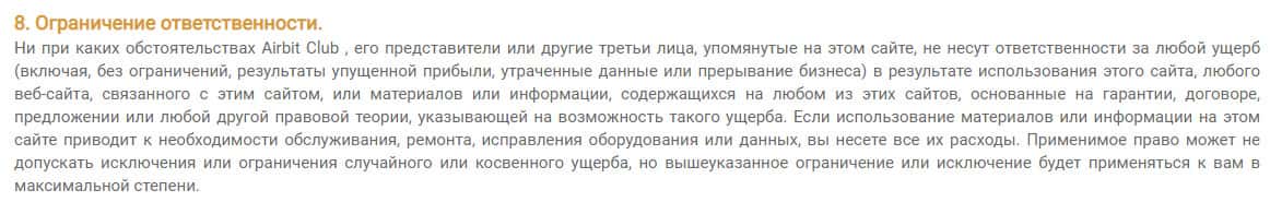 Раздел 8-й "Ограничение ответственности" договора махинаторской криптобиржи Аир Бит Клуб сообщает о том, что ни при каких обстоятельствах не будет нести ответственности за любой ущерб либо предоставленные сведения, также они не дают никаких гарантий при обслуживании для своих форекс игроков. В общем, лохотронское отношение к трейдерам.