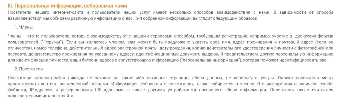 В III разделе идет речь о том, что махинаторы из Аир Бит Клуб собирают широчайший спектр личных данных о своих форекс пользователях. Но поражает тот перечень данных, которые эти шарлатаны хотят заполучить и с какой целью она им вообще нужна. Но страшно за судьбу трейдеров, так как их личная информация будет слита в неизвестные источники.