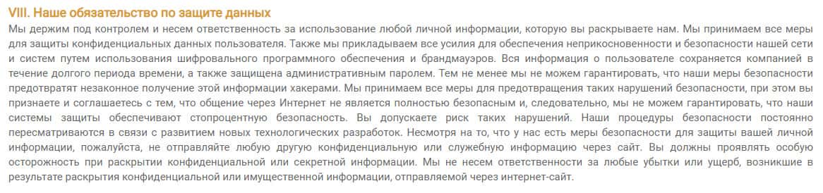 8-й раздел "Наше обязательство по защите данных" выходит за все рамки допустимого, в котором говорится, что псевдоброкер Аир Бит Клуб не может гарантировать того, что их меры безопасности предотвратят незаконное получение левыми источниками личных сведений о трейдерах. В общем, в очередной раз сняли с себя всю ответственность за свои же ошибки.