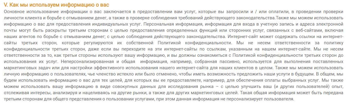В V разделе политики конфиденциальности речь идет о том, что личные сведения и сведения учетной записи форекс игроков могут быть раскрыты третьим сторонам с целью предоставления каких-то непонятных услуг. Вопрос, а где момент, что каждый клиент должен дать разрешение на использование таких данных другими компаниями. Сплошное кидалово.