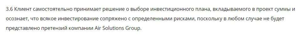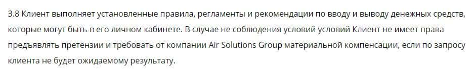 Пункт 3.8 акцентирует внимание на том, что клиент не вправе предъявлять претензии к жуликам AirSolution Site и требовать материальной компенсации. Лохотрон, одним словом.