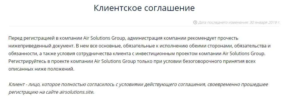 Клиентское соглашение шарлатанской хайп-компании Аир Солюшин