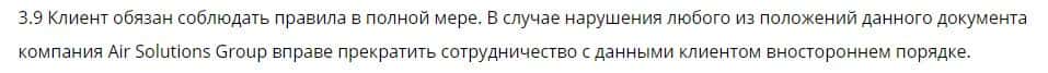 В пункте 3.9 указано, что Аир Солюшин имеет полное право прекратить сотрудничество с пользователями в одностороннем порядке, если посчитает какое-то нарушение за клиентом.