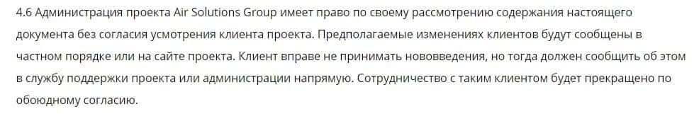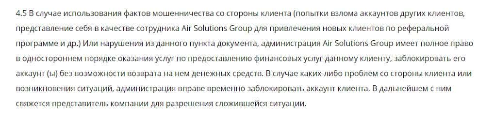 Далее говорится, что AirSolution Site может, если определит нарушение со стороны клиентов, заблокировать аккаунт без возможности возврата денег назад с торгового счета.