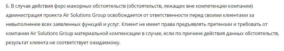 В пункте шестом говорится, что форс-мажор также освобождает мошенников Аир Солюшин от каких-либо компенсаций трейдерам. Клиенты не вправе жаловаться на действия дилера.