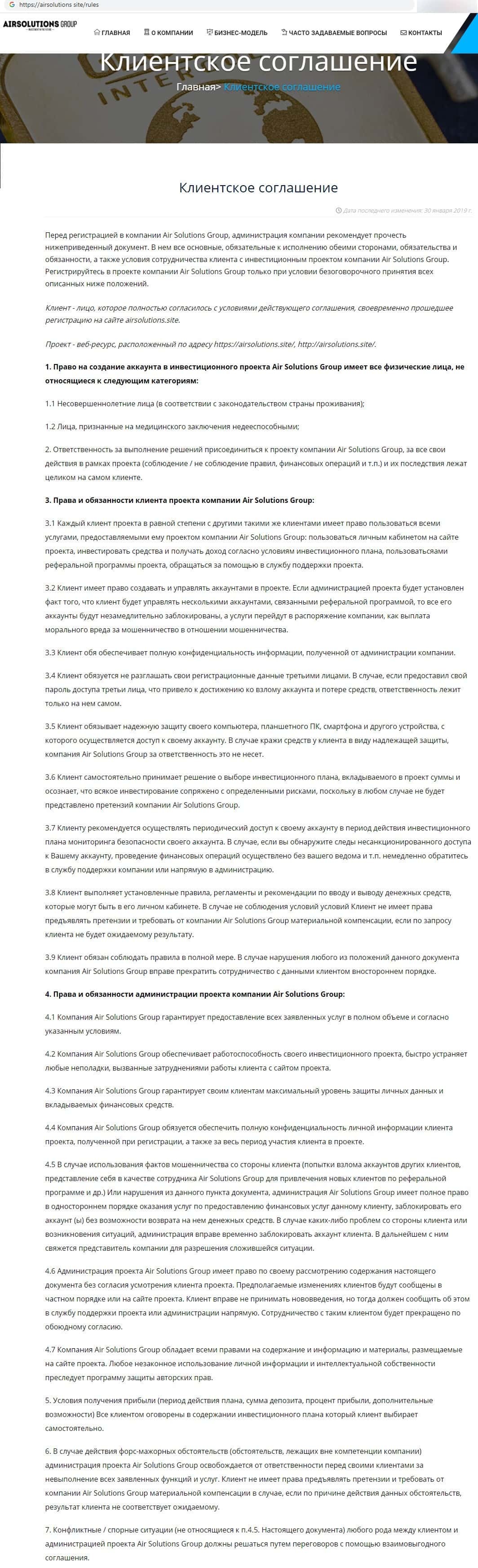 Далее Вы можете ознакомиться с полным текстом клиентского соглашения аферной хайп-конторы AirSolution и увидеть воочию, что оно имеет много нечестных уловок и махинаций.