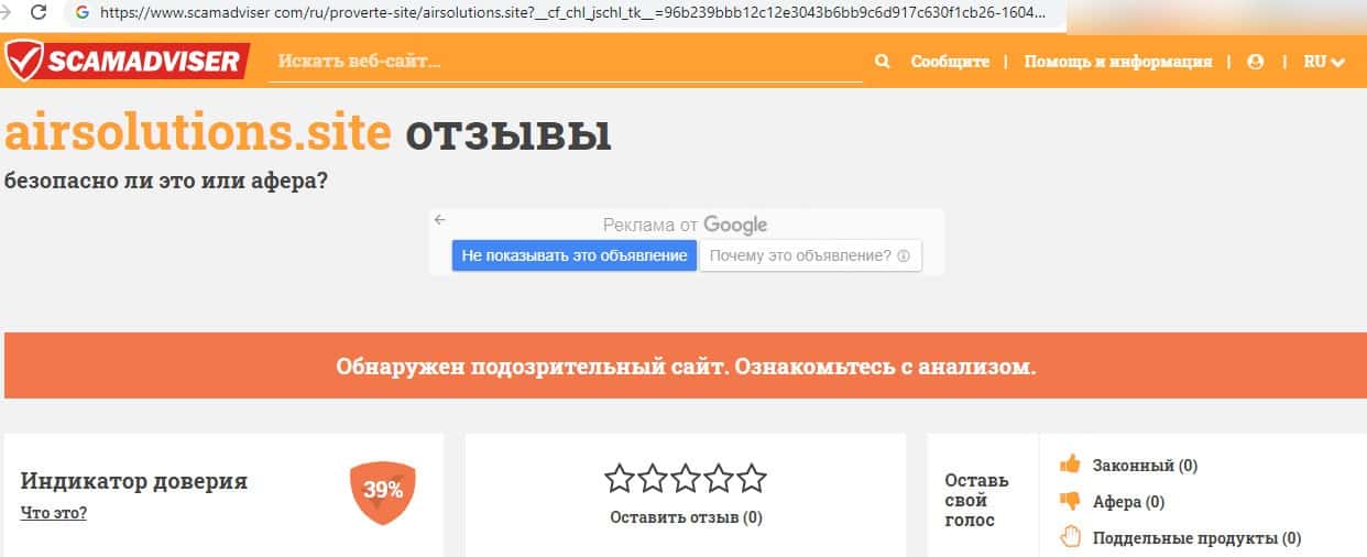 Фальшивая контора AirSolution Site по мнению уважаемого ресурса scamadviser com имеет крайне низкий рейтинг 39 %, также данный веб-портал может быть очень опасным.