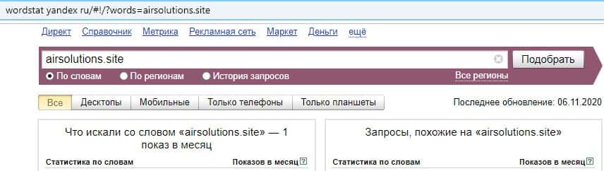 Поиск доменного имени с точкой "airsolutions.site" также не увенчался значительным успехом, поскольку поисковая система Яндекс продемонстрировала один запрос за месяц.