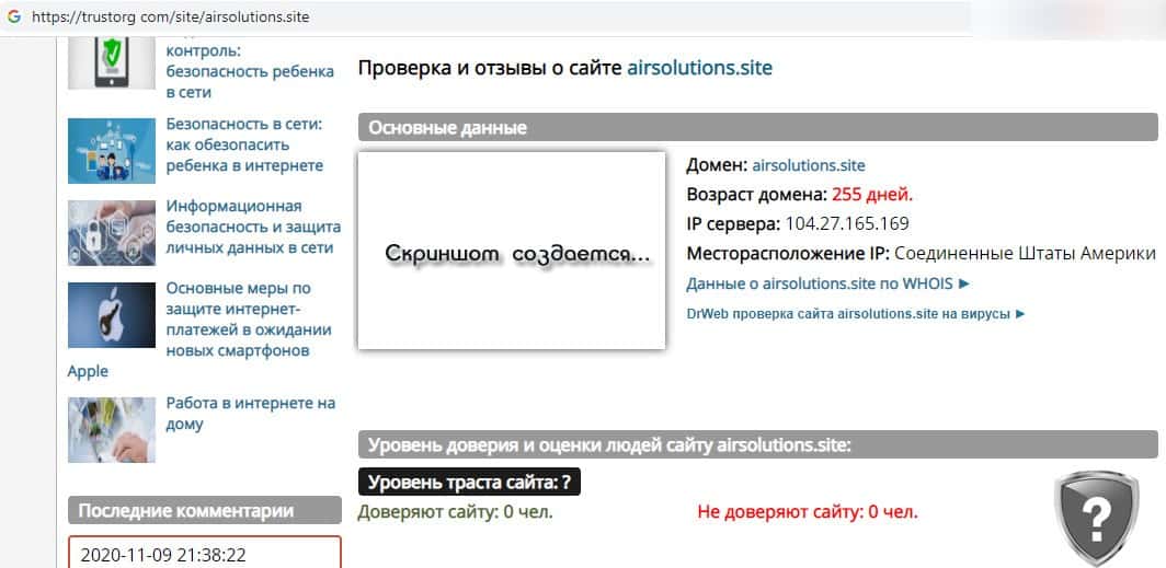 Согласно проведенному анализу по поводу домена airsolutions site, то его собственников определить вообще не удалось. Это означает, что лжеброкер предпочитает скрываться в тени.