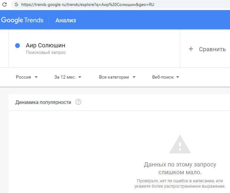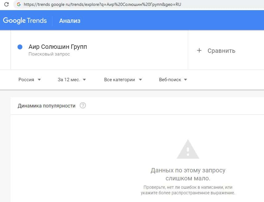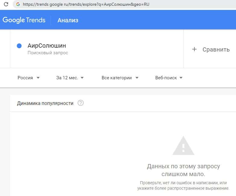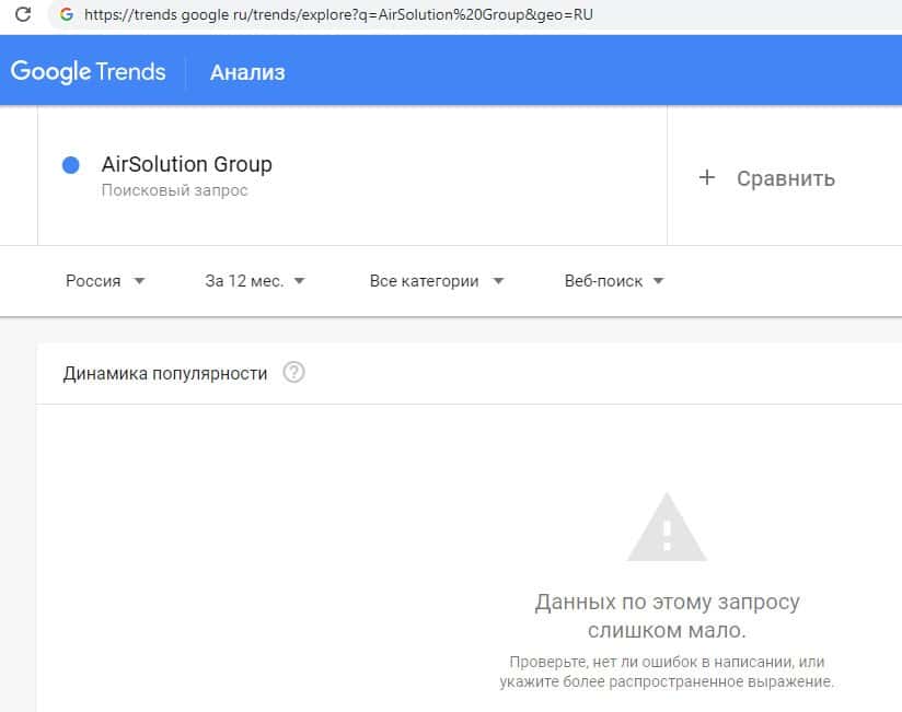 Количество запросов от интернет-пользователей по поиску бренда на русском языке без пробела "АирСолюшин" в поисковой системе Гугл Трендс также было очень небольшим.