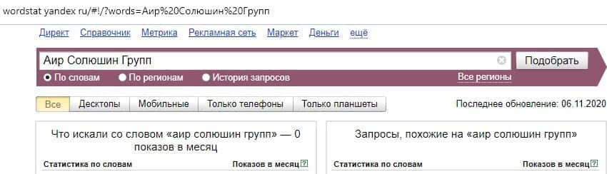 Количество запросов по брендовому имени "Аир Солюшин", совершенного с пробелом на русском языке, по данным сервиса wordstat yandex ru, равняется значению: 0 раз.