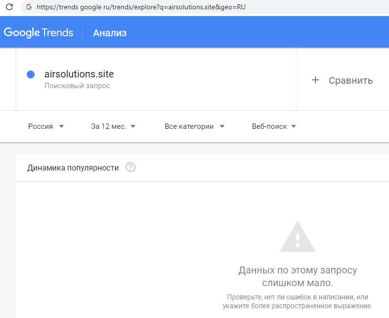 Брендовое имя "airsolutions.site" на английском языке с точкой ни разу никто из интернет-пользователей не пытался даже найти в поисковой системе Гугл Трендс.