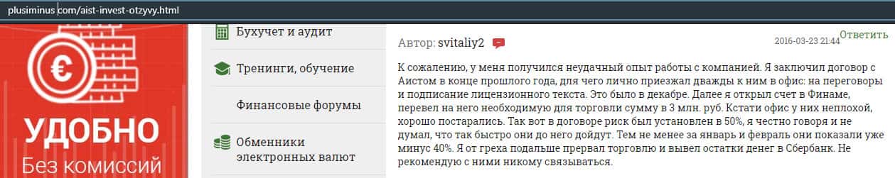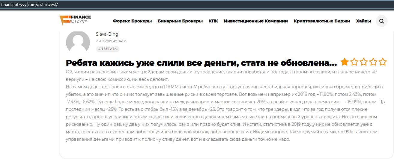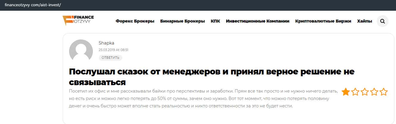 Далее представлен отзыв от человека, который рассказывает, что у него был неудачный опыт работы с мошенниками AistInvest Ru. Он даже приезжал к ним в офис, но это не спасло его от слива. Когда он начал разбираться с ними, типа кто виноват, аферисты все списали на изменение рынка.