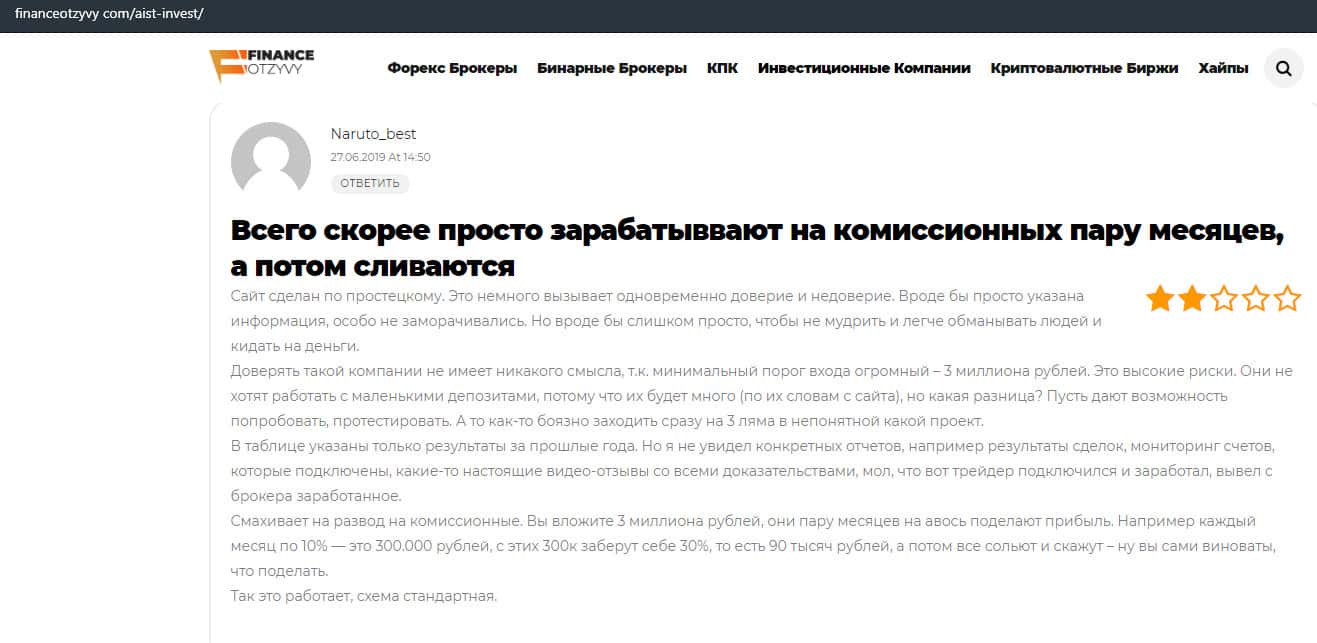 По мнению автора следующего отзыва, только ненормальный человек может стать клиентом этого лохотрона. Контора AistInvest Ru даже не смогла создать нормально свой ресурс, а минималку они просят вложить три миллиона рублей. Нет гарантий и лицензий, а менеджеры обещают нереальную прибыль.