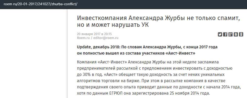 В следующей статье рассказывается, как инвестиционный лохотрон AistInvest Ru занимается рассылкой спама по многим электронным адресам. Есть некоторая информация, что этот лохотрон был основан одним человеком под псевдонимом Александр Журба, хотя, как он заявляет он уже с 2017 года таковым не является.