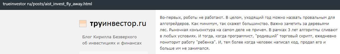 Также стоит понимать, что в конторе AistInvest Ru роботы не работают и прошлый год можно считать провальным, даже не смотря на то, что они рисуют какие-то заоблачные проценты. Впрочем так бывает со всеми подобными фондами, которые по окончанию просто соскамятся и сбегут с награбленным.