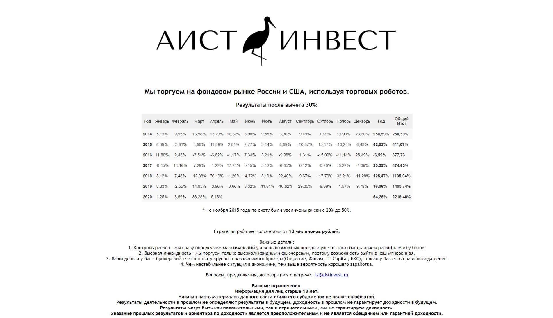 Мошенническая контора AistInvest Ru особо не напрягаясь, создала сайт-одностраничник с минимальной информативностью. Там вы можете увидеть преобразованную экселевскую таблицу с выдуманными результатами и некоторые комментарии к ним. Вряд ли нормальный человек будет вкладывать деньги в эту шарашкину контору.