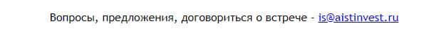 Из контактных данных у аферистов AistInvest Ru только электронная почта, потому что они очень сильно шифруются от правоохранительных органов. В основном свою деятельность они ведут через тайные встречи и связаться и договориться с ними можно лишь по следующему электронному адресу: