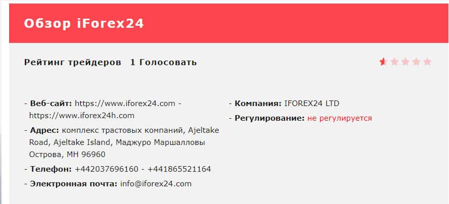 Репутация махинаторов iForex 24 осталась даже после того, как контора слилась. На некоторых интернет ресурсах остались обзоры. которые сайты делали ещё на работающую фирму. В данном обзоре идёт речь о том, что фирма не регулируемая, и её стоит всем избегать. Нет ни одного обзора, который хорошо бы отзывался о бывшем брокере.