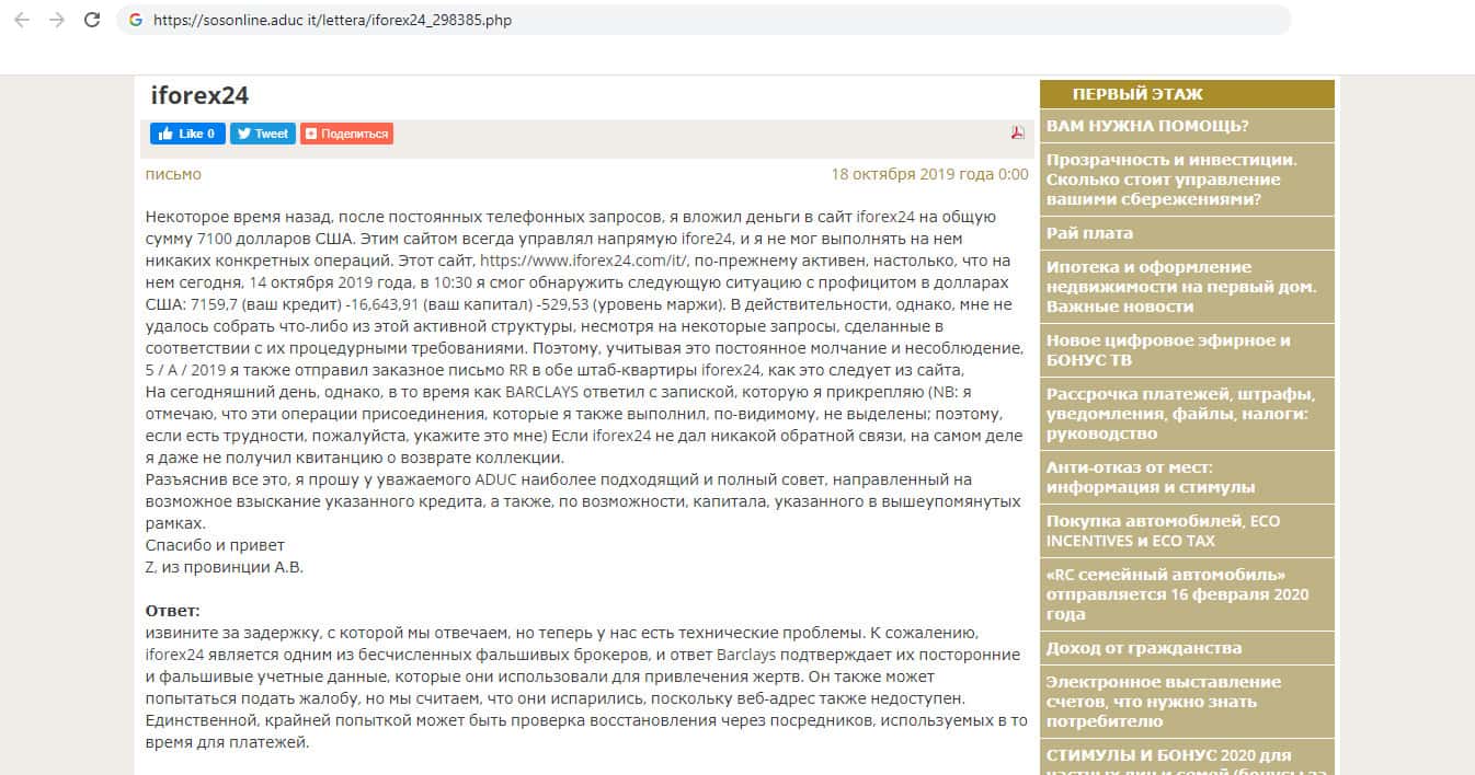 sosonline.aduc it - жалоба на махинаторов Ай Форекс 24