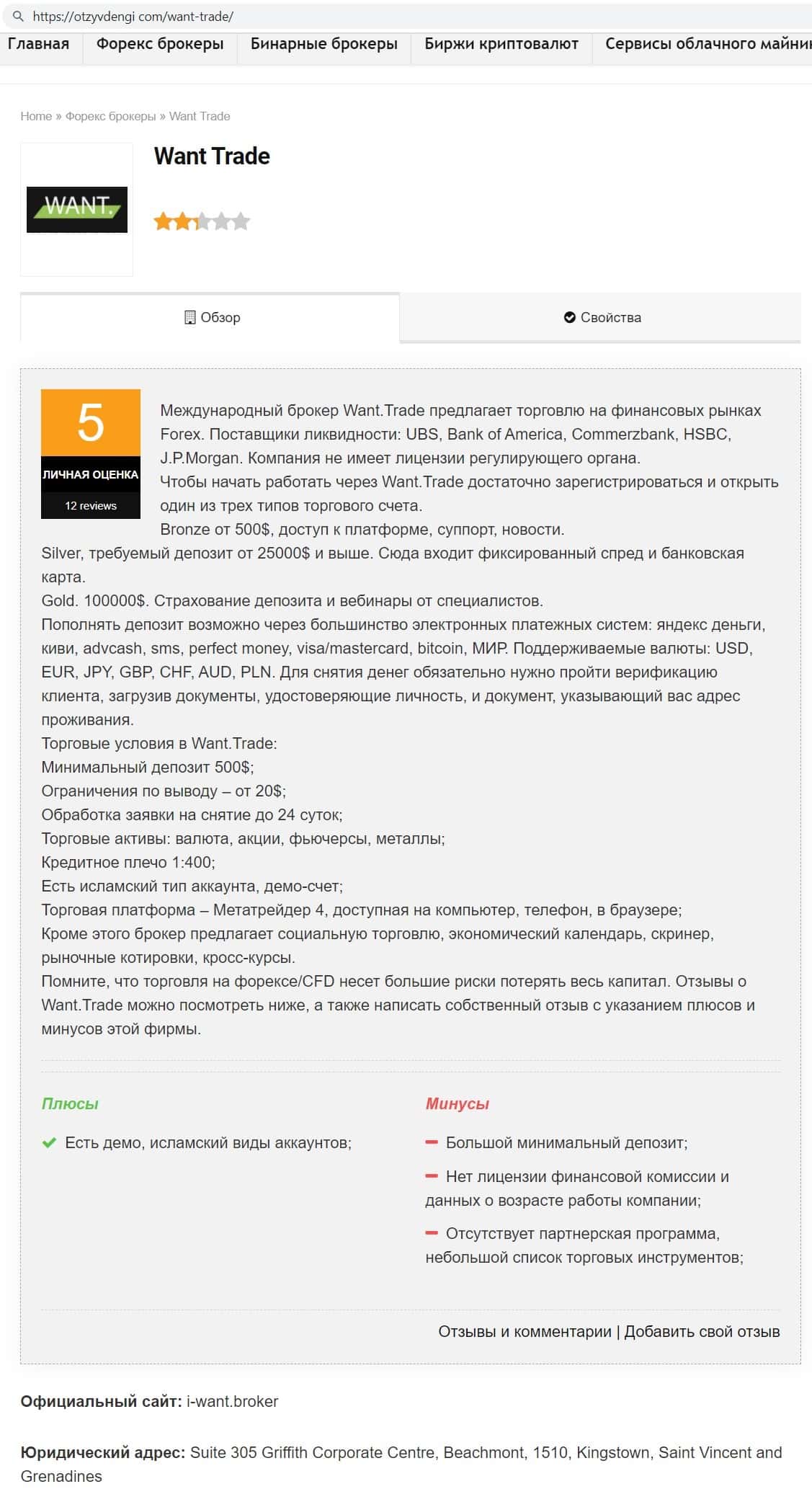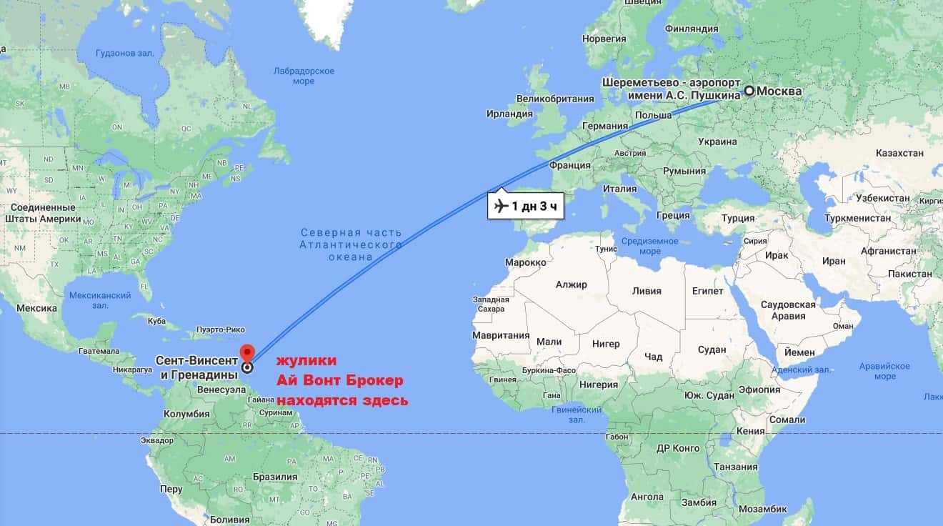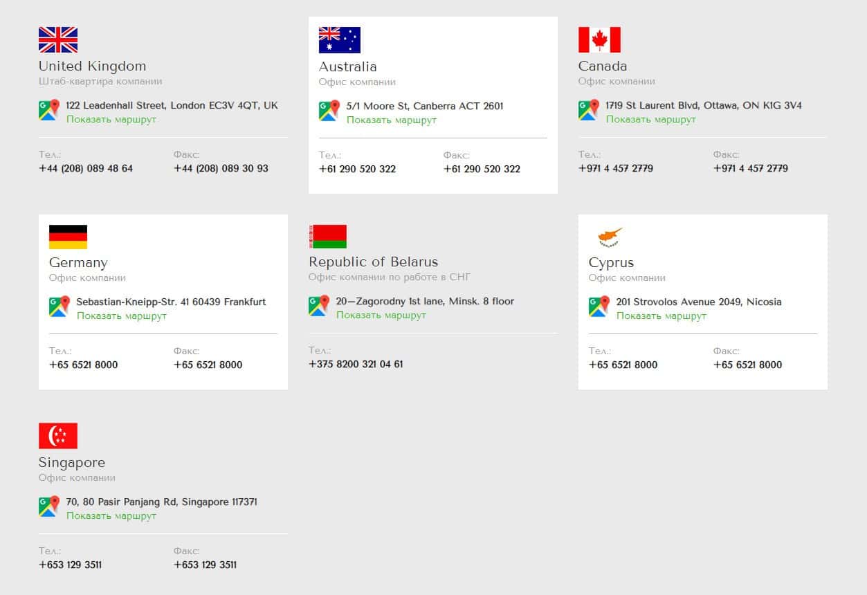 На сайте брокера Ай Вонт Брокер имеется адрес офиса в офшоре Сент-Винсент и Гренадины, а также адреса офисов в разных странах мира.