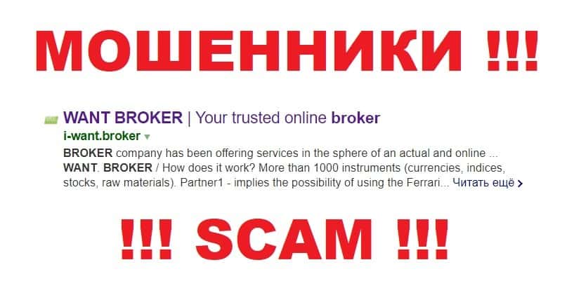 Ай Вонт Брокер - это мошенническая организация, ранее обворовывала людей с сайта I-Want Trade. Контора не имеет лицензии на брокерские услуги, уже одно это должно заставить усомниться в честности компании. То, что Ай Вонт Брокер - шарашкина контора, а не порядочная организация, подтверждает и исследование доменного имени. Помимо этого, на сайте данного лжеброкера используется программное обеспечение Мета Трейдер 4, которое создает команда аферистов под названием MetaQuotes. Ни в коем случае не несите свои деньги в лохотрон под названием I-Want Broker и не способствуйте обогащению мошенников!