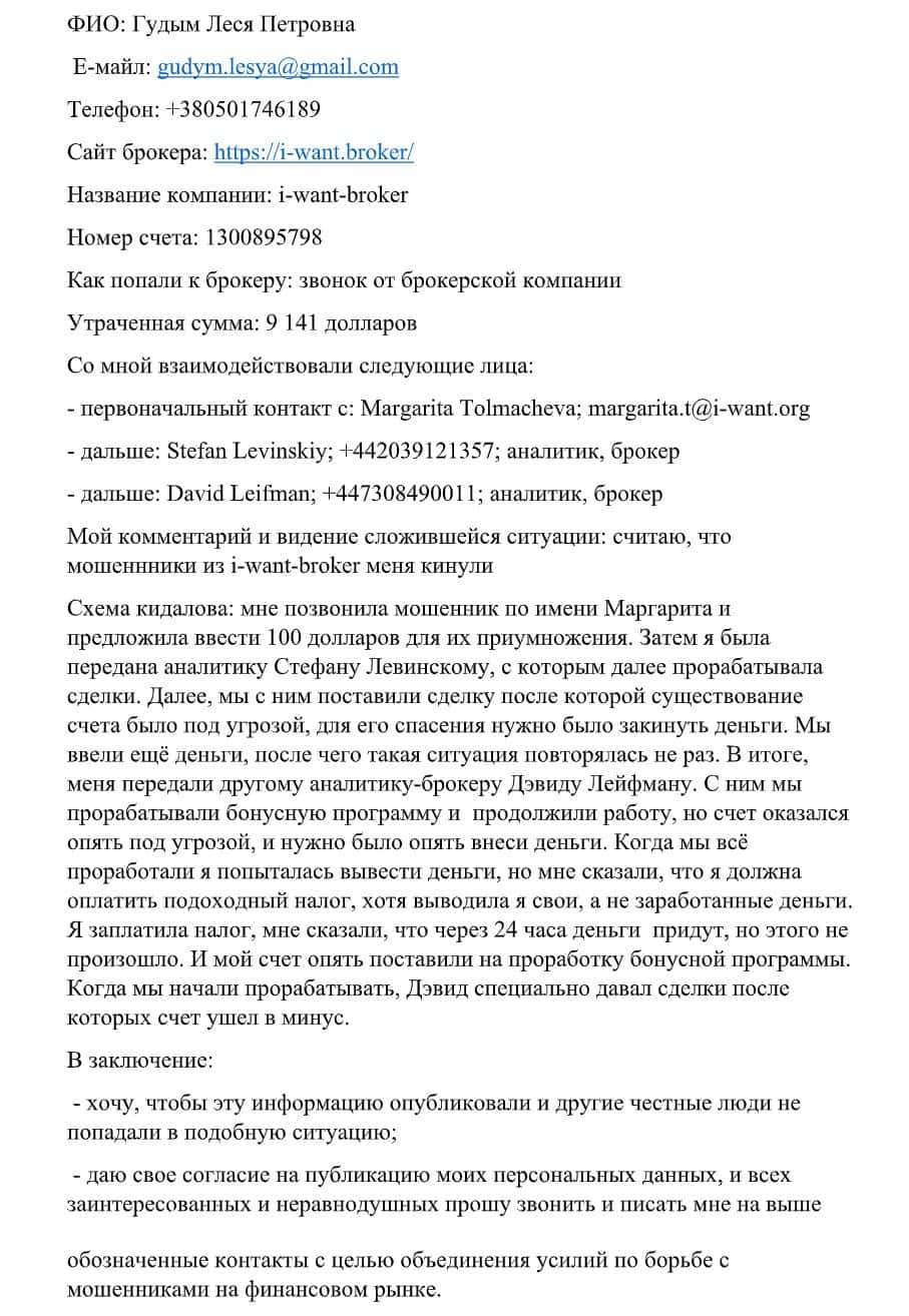 Ниже предлагаем увидеть скрин письма с жалобой на псевдо-брокерскую организацию Ай Вонт Брокер, которая кинула клиентку на 9141 долларов США.