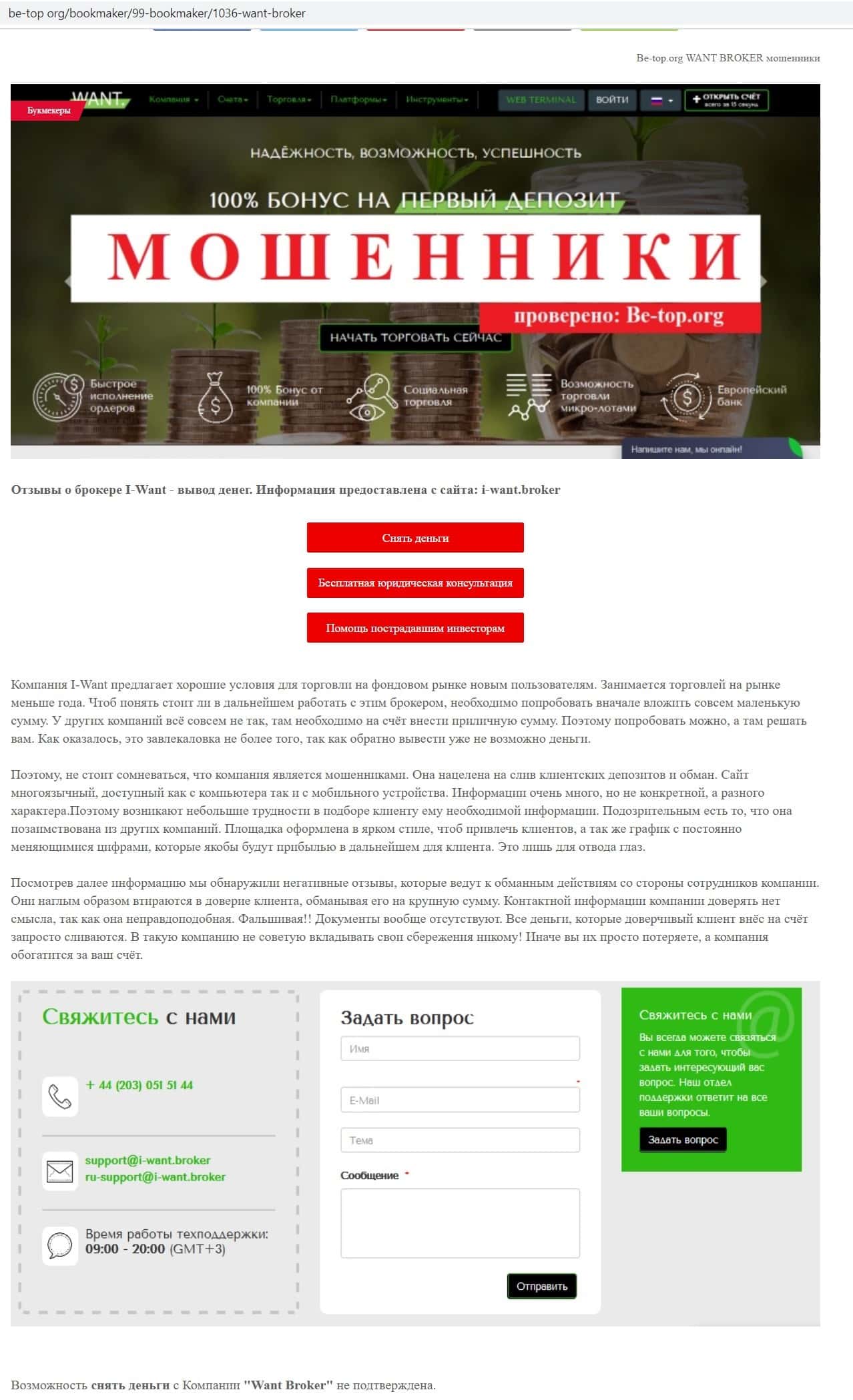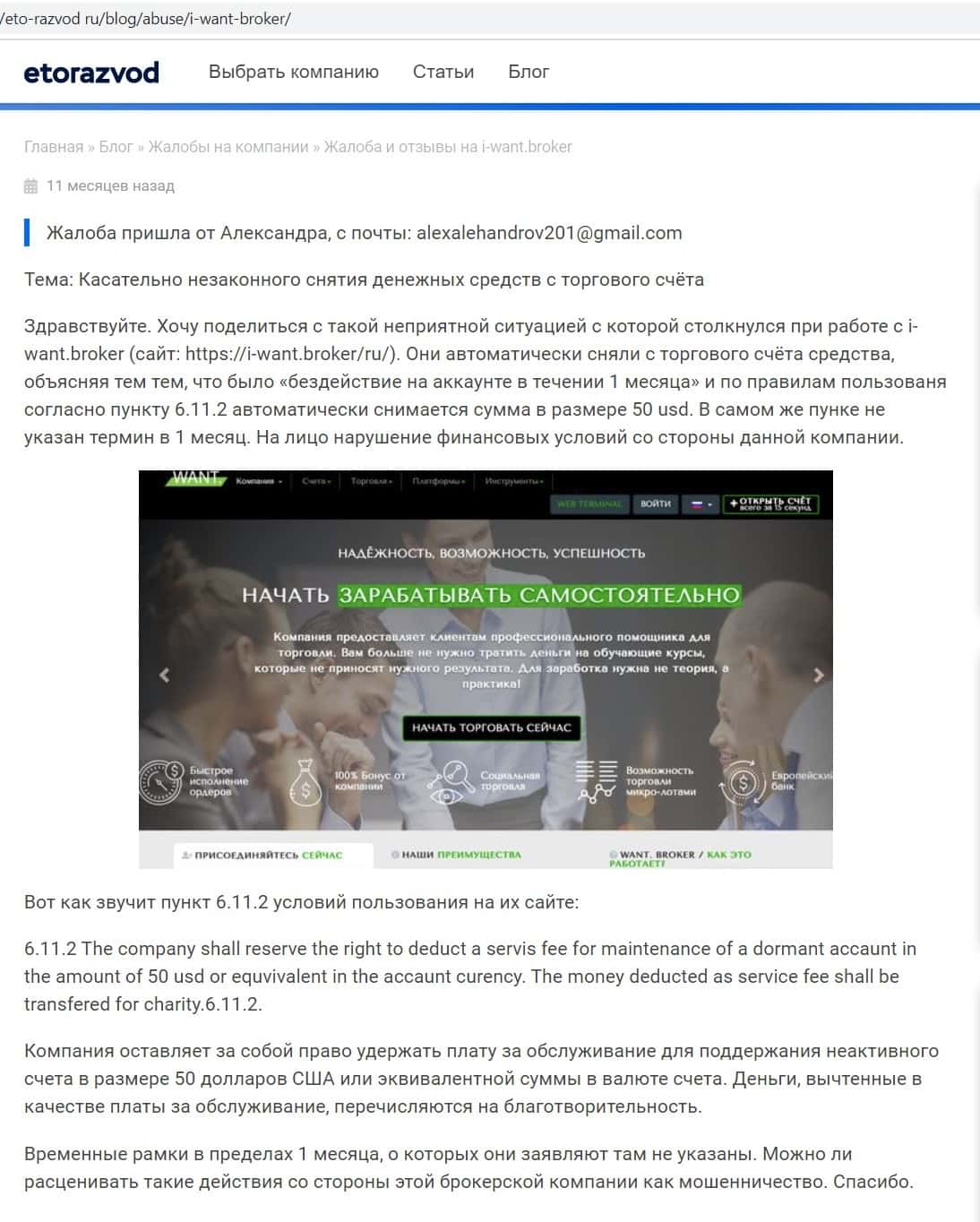 В статье на сайте eto-razvod ru опубликована жалоба молодого человека, у которого аферисты Ай Вонт Брокер отжали средства, находящиеся на его счете, и отзывы других людей.