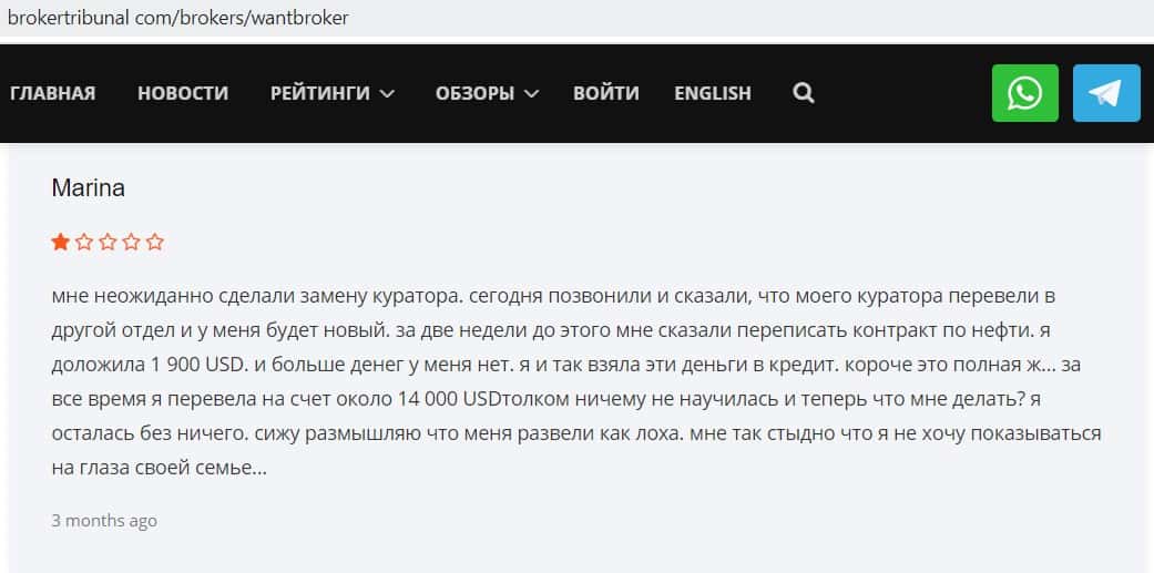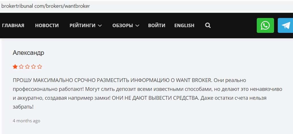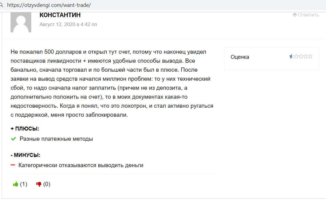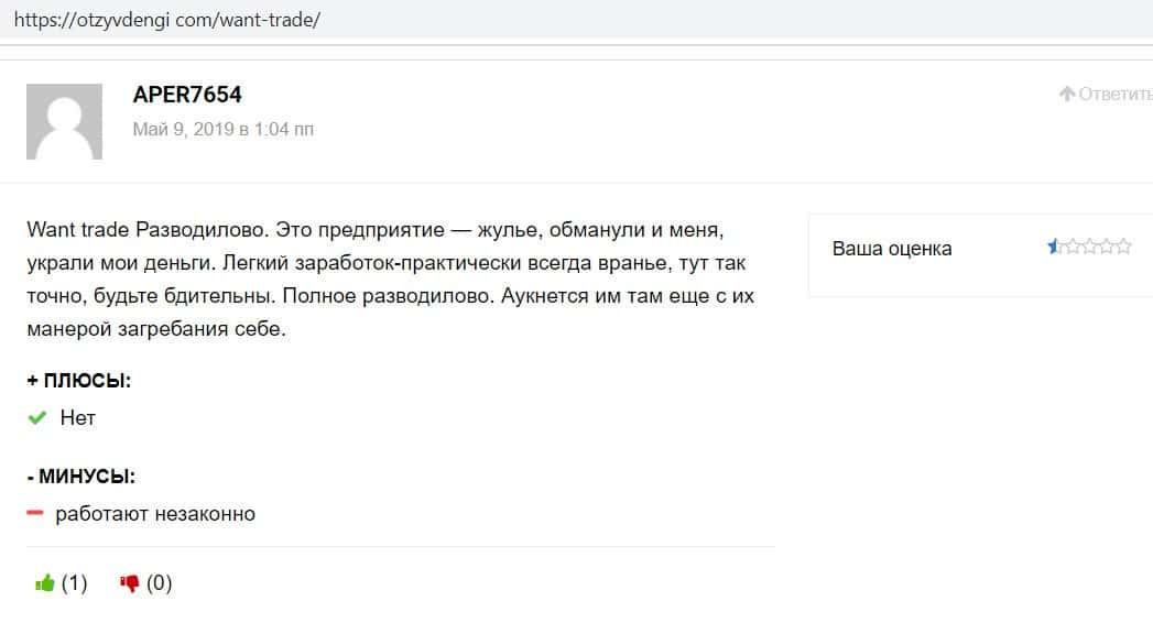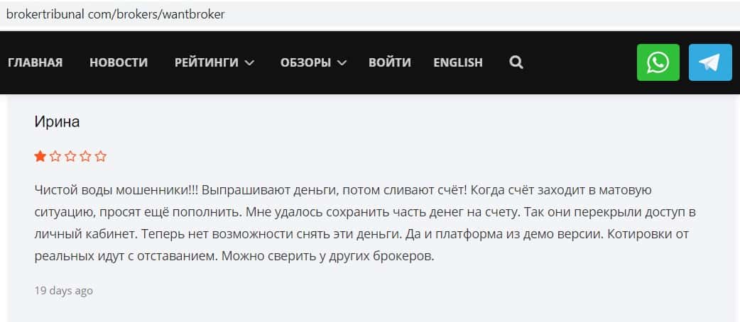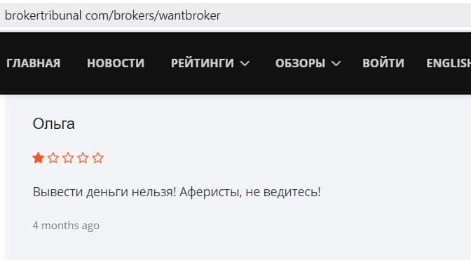 Девушка написала в отзыве на сайте Брокертрибунал, что вывести деньги с площадки Ай Вонт Брокер нельзя, никто не заходите туда и не создавайте там депозит!