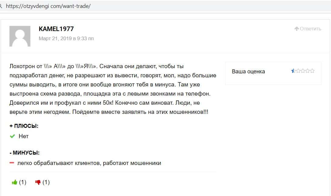 Камил написал, что он потерял 50000 рублей на сайте Ай Вонт Брокер. Там уже выстроена схема развода, сначала заставляют пополнять баланс на крупные суммы, а потом не отдают.