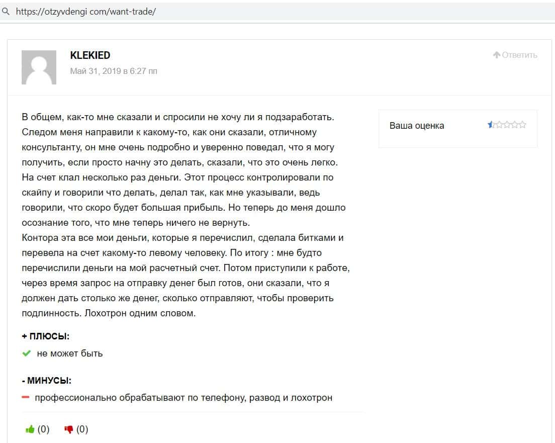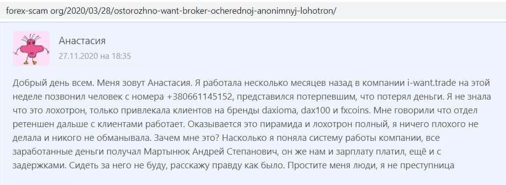 Анастасия написала в отзыве, что она тоже работала в конторе Ай Вонт Брокер, но не знала, что это лохотрон, ее заставляли привлекать людей, а потом кидали их на деньги.