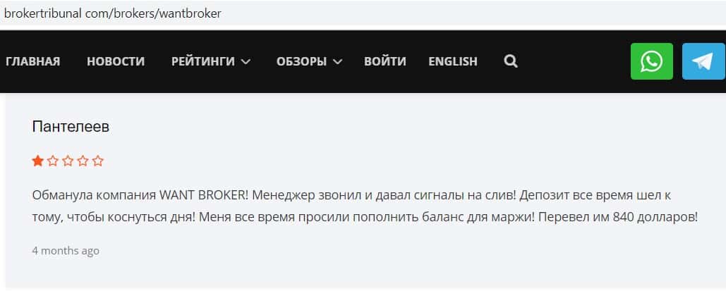 Мужчина пишет в своем отзыве, что его обманула компания Ай Вонт Брокер. Менеджер звонил и давал сигналы на слив депозита. Трейдер потерял 840 долларов на этом сайте.
