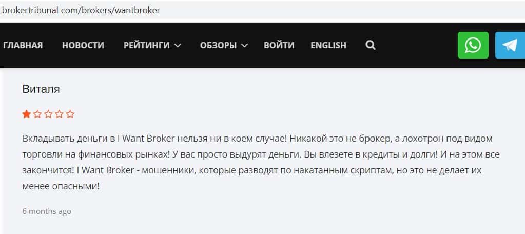 К этому отзыву присоединился Виталий, который пишет, что Ай Вонт Брокер - никакой не брокер, а обычный лохотрон, без финансового органа, вкладываться сюда нельзя.