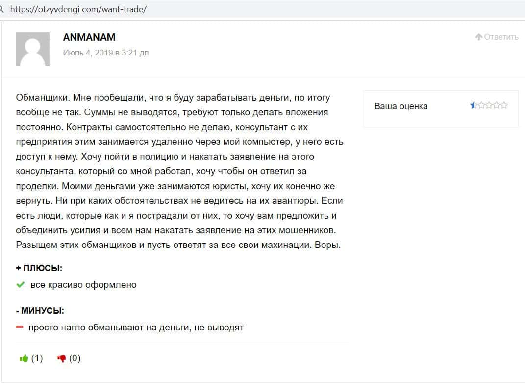 Клиент шарашки Ай Вонт Брокер пишет, что люди, которые там работают - обманщики. Все время просят пополнить еще депозит, а, когда доходит до вывода денег, отказывают.
