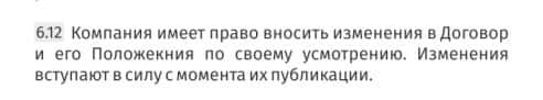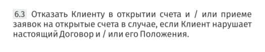 Пункт 6.3 уведомляет пользователя, что ему могут отказать в открытии счета или исполнении заявки при нарушениях настоящего соглашения.