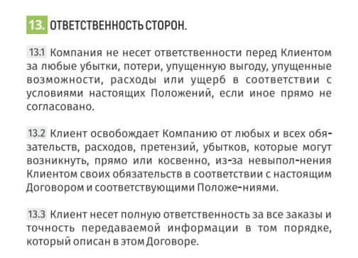 В разделе 13 компания Ай Вонт Брокер пишет, что отказывается от ответственности за любые потери и ущерб клиента на их сайте, полученные в ходе торговли.