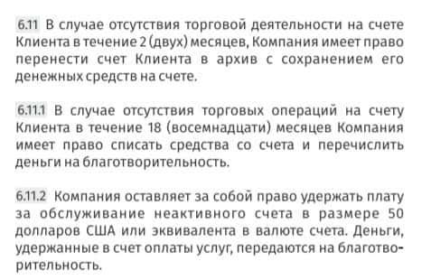 Пункт 6.11 сообщает пользователям, что контора Ай Вонт Брокер может взять с клиента комиссию в размере 50 долларов за неактивный счет, причем не сообщаются сроки активности.