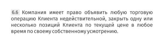 Далее, компания Ай Вонт Брокер заявляет, что может, исходя из своего желания, закрыть любую сделку клиента по текущей цене или же признать сделку недействительной.