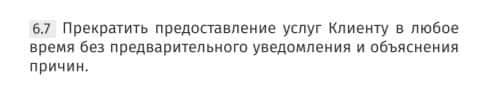 Следующий пункт вообще нарушает все права клиента, так как в нем говорится, что в любое время брокер может отказать человеку в обслуживании без всяких причин.