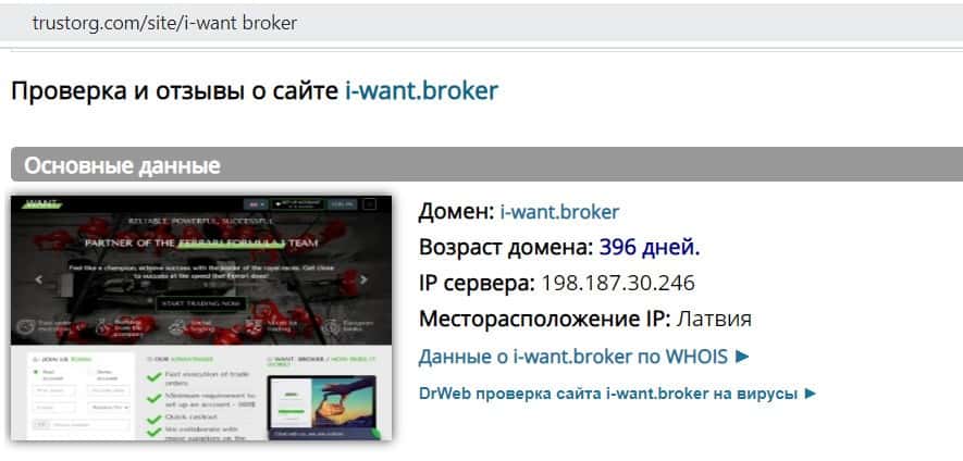 По данным сервиса Трасторг, возраст доменного имени i-want broker составляет 396 дней. Мошенники обманывают своих клиентов уже целый год.
