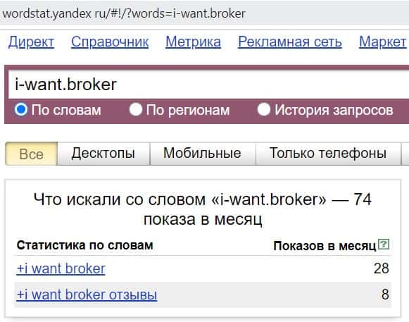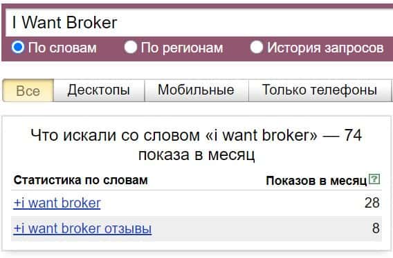 В поисковой системе Яндекс сайт брокерской конторы "i-want.broker", вбитый в строку с точкой, пользователи искали 74 раза за месяц.