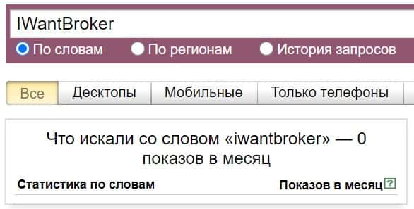 Название мошеннической конторы "IWantBroker", написанное на английском языке, пользователи не искали в системе Яндекс ни одного раза за месяц.
