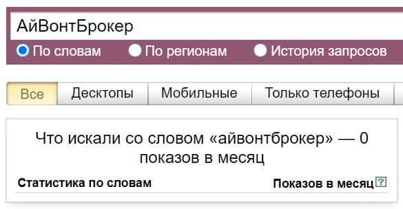 Название бренда на русском языке без пробела "АйВонтБрокер", пользователи не искали в системе Яндекс ни разу.