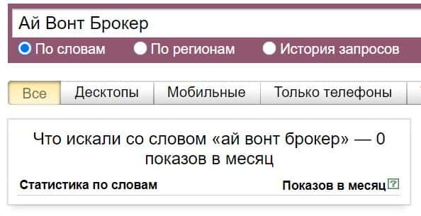 То же название на русском языке, но с пробелами "Ай Вонт Брокер", пользователи также почти не искали в системе Гугл.