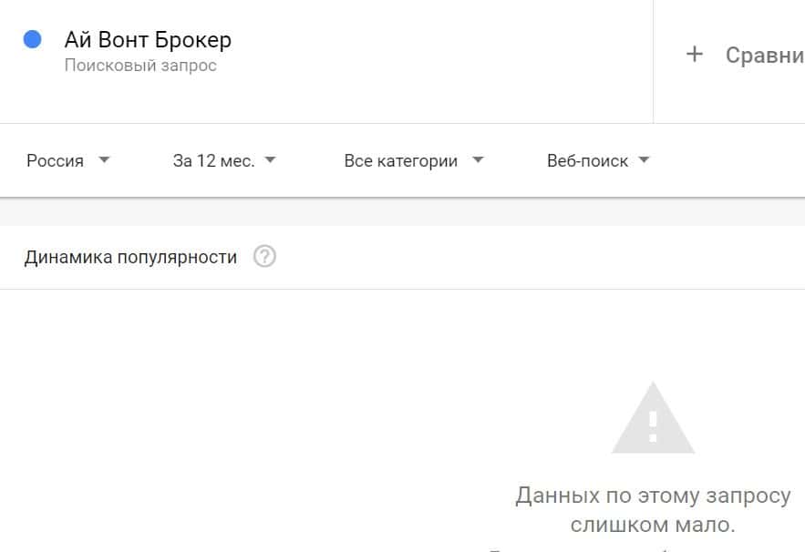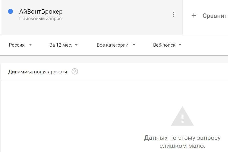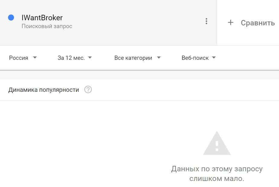 Посмотрим, насколько популярно название бренда "IWantBroker", написанное на английском языке. Данных по этому запросу нет, так как люди не искали его в Гугл.