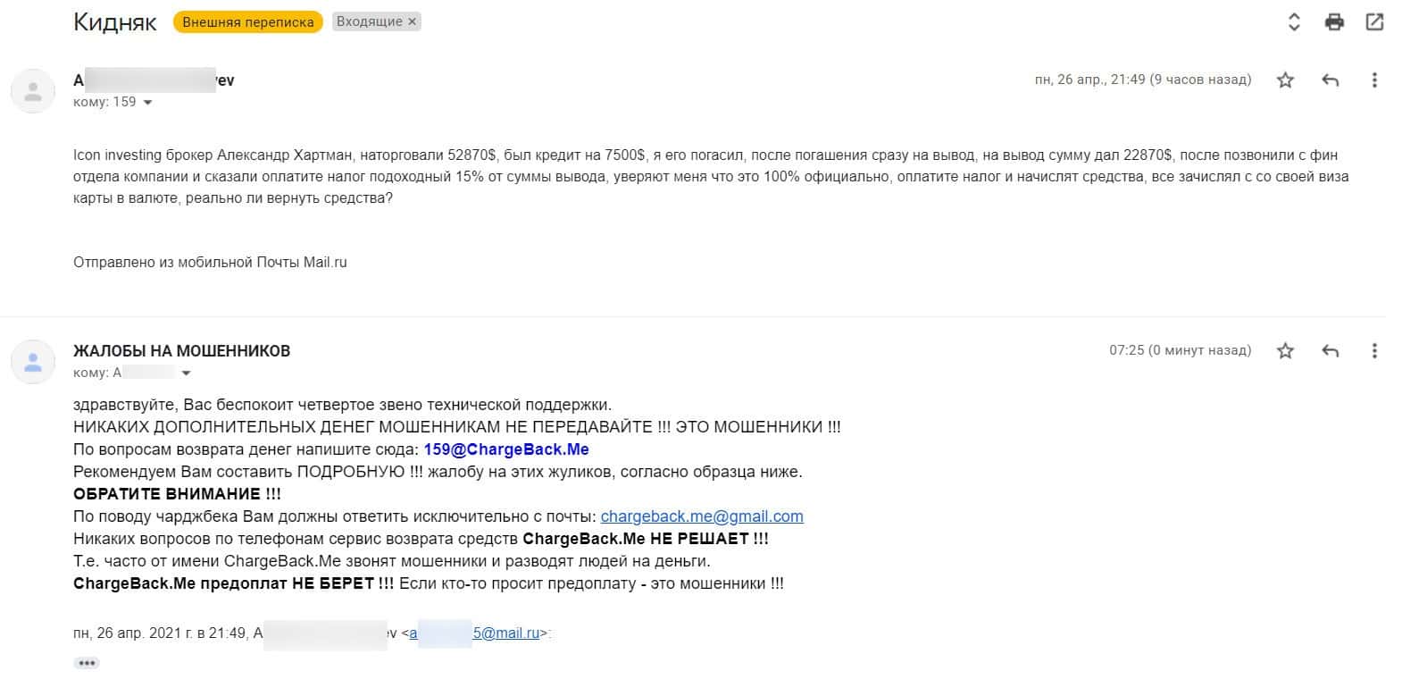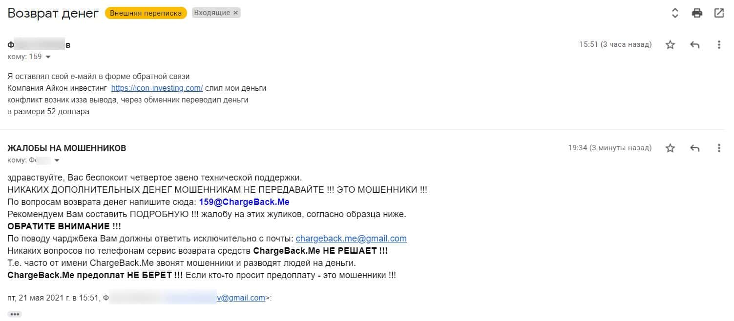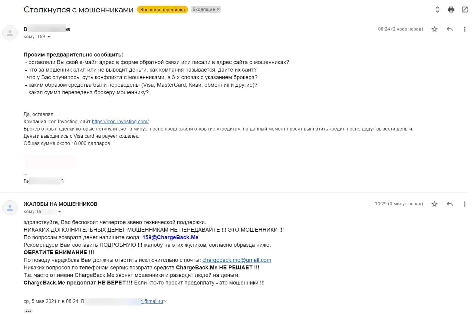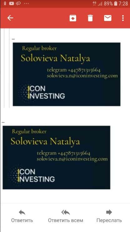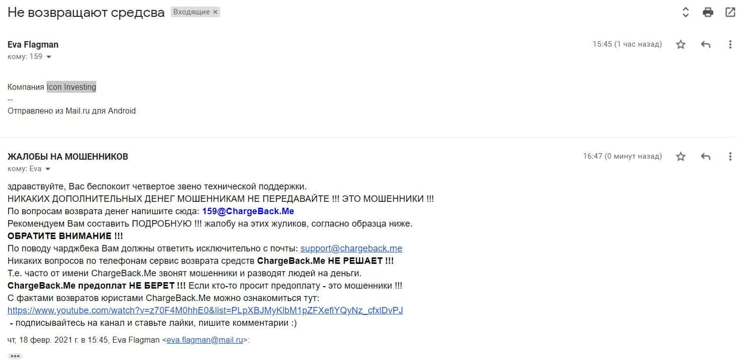 Так же мы проверили основную электронную почту компании разводил IconInvesting, которая так же указанна в контактных данных. Почту фирма указала верную, Это позволяет мошенникам не общаться с клиентами на прямую, а просто отправлять им заранее готовые сообщения, которые фирма рассылает всем клиентам.