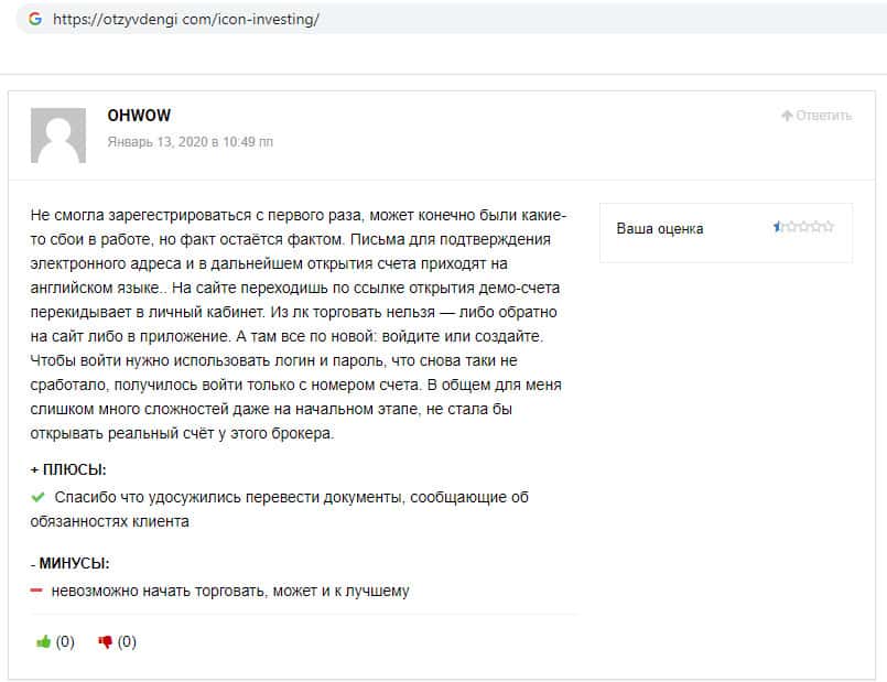 Данный пользователь сообщает в своём отзыве о компании разводил Айкон Инвестинг, что так и не смог начать торговлю, так как столкнулся с препятствиями в виде регистрации, она оказалась не такой простой как хотелось бы, но в добавок ко всему, письма, которые приходят на электронную почту для подтверждения все на английском языке.