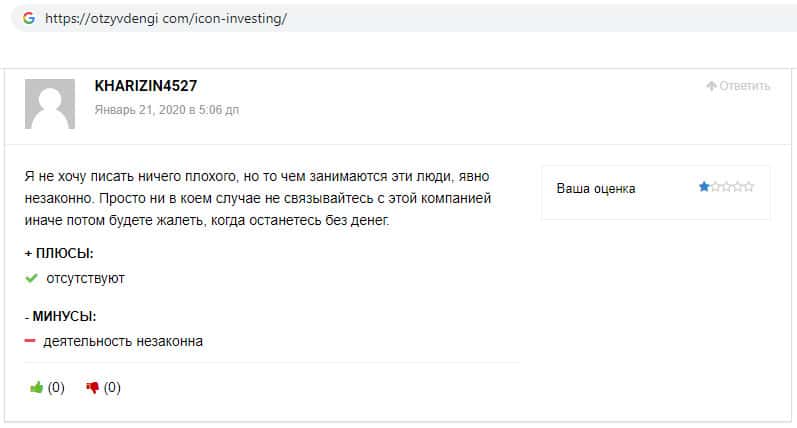 Изначально пользователь не хотел писать ничего плохого в адрес лохотроников Айкон Инвестинг, но он всё таки сказал, что деятельность компании является незаконной, и он предупредил пользователей, что бы они ни в коем случае не связывались с этой компанией, так как потом будут очень жалеть, когда останутся совсем без денег.