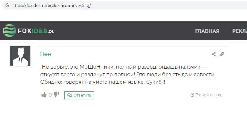В данном отзыве мы видим как пользователь предупреждает людей о том, что бы они не верили компании IconInvesting потому, что они мошенники, если один раз инвестировать то жулики не остановятся и будут требовать больше, пока не разденут полностью. Так же он добавляет, что это люди без стыда и совести о отберут деньги у каждого клиента.