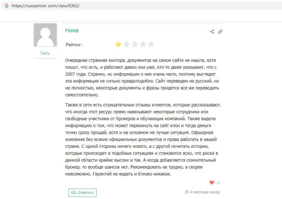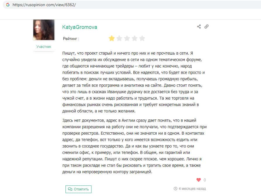 Один пользователь, изучив компанию кидал IconInvesting написал о ней отзыв,, в котором сказал, что компания очень странна, документации нет, хотя пользователь искал, так же фирма врёт о своём возрасте, так же его удивило большое количество отрицательных отзывов, за столь не долгое существование компании. Так же он сообщает, что нет никаких гарантий заработка в компании.